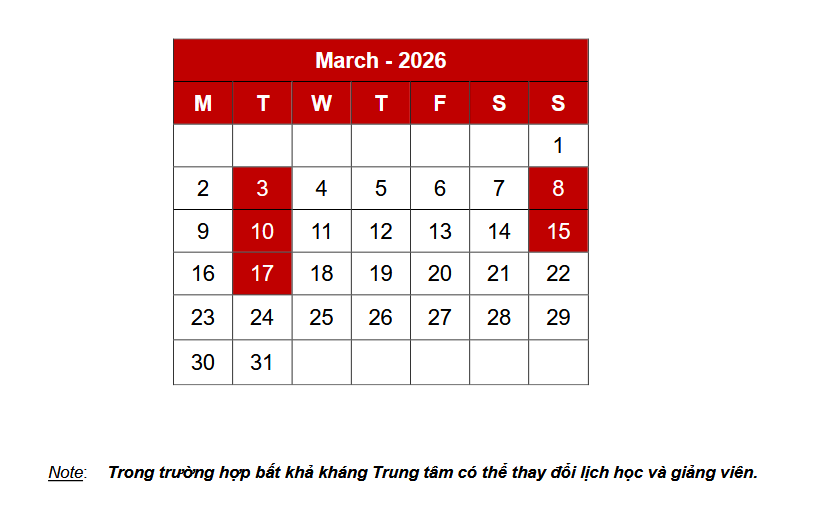 📅 Thời gian học : 18:30 – 21:30 Thứ Ba và 08:30 – 11:30 Chủ nhật