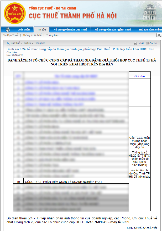 [Thông báo công nhận tổ chức cung cấp hóa đơn điện tử FAST của Cục thuế Hà Nội]