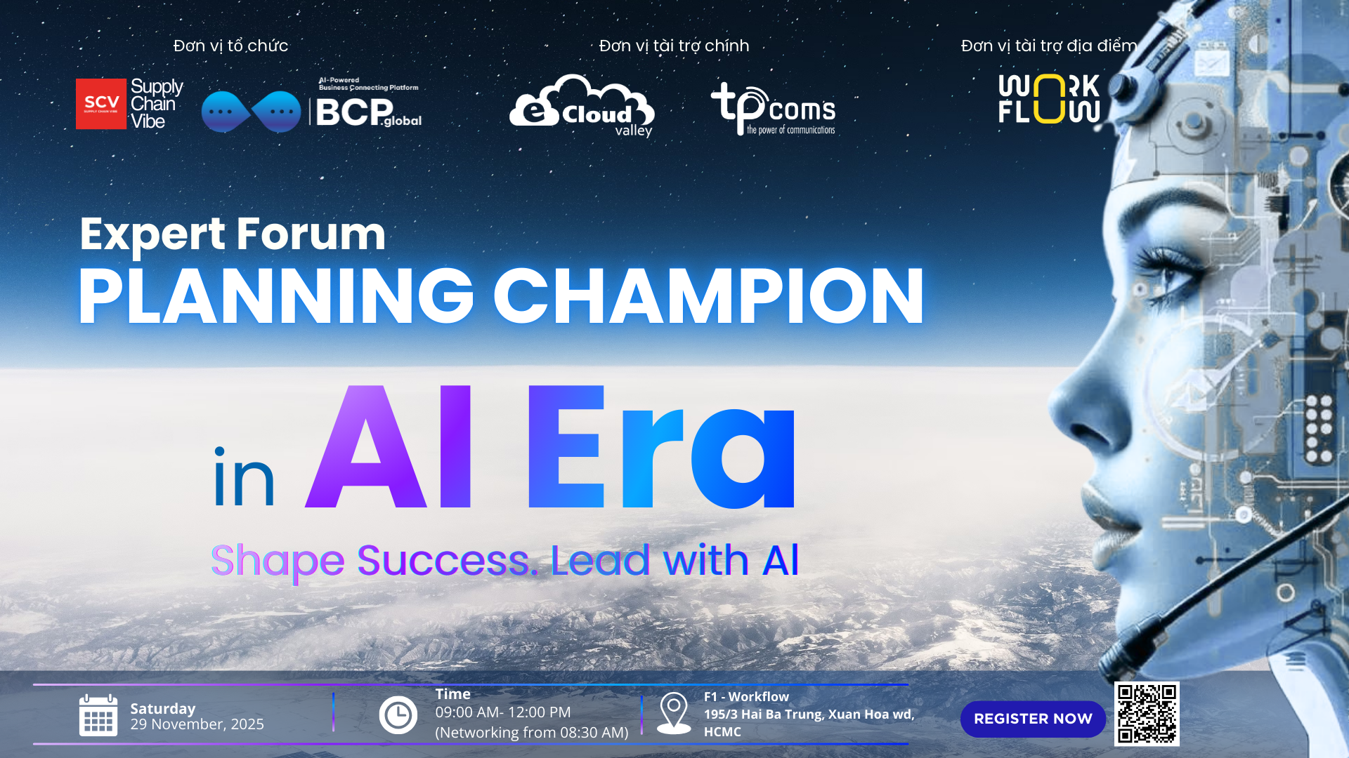 🌍 Với tầm nhìn đó, BCP – nền tảng kết nối giao thương B2B toàn cầu và cộng đồng công nghệ AI (AIPartners Asia) – phối hợp cùng Supply Chain Vibe (SCV) – cộng đồng chuyên gia chuỗi cung ứng hàng đầu Việt Nam – tổ chức #EXPERT FORUM: PLANNING CHAMPION IN AI ERA | SHAPE SUCCESS . LEAD WITH AI
