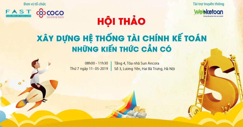 Hội thảo “Xây dựng hệ thống tài chính kế toán – những kiến thức cần có” nằm trong hoạt động hợp tác giữa Công ty Phần mềm FAST và Công ty COGO Coworking nhằm thúc đẩy hệ sinh thái khởi nghiệp tại Việt Nam. FAST và COGO với sự giúp truyền thông từ Webketoan mong muốn mang đến một buổi hội thảo với các nội dung hữu ích nhất dành cho các doanh nghiệp khởi nghiệp.