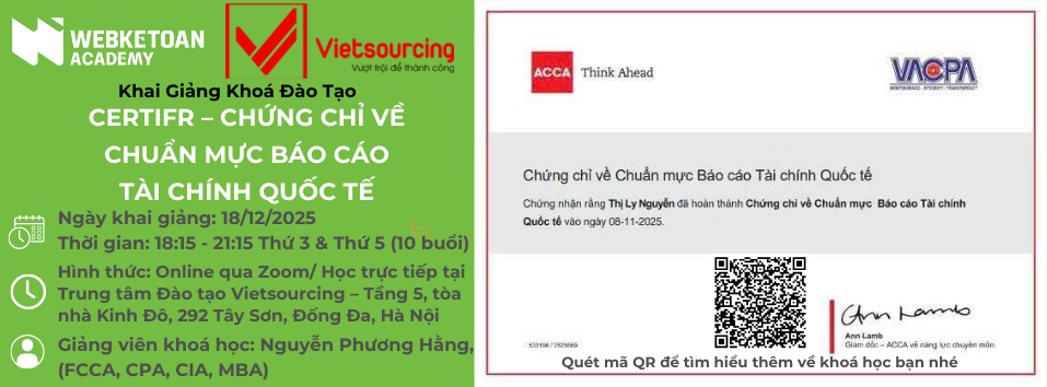 Bạn đang muốn trang bị và bổ sung kiến thức về các chuẩn mực quốc tế IFRS, nâng cao khả năng cạnh tranh và minh bạch trong môi trường kinh doanh toàn cầu. Hãy tham gia khoá học: CERT IFR – CHỨNG CHỈ VỀ CHUẨN MỰC BÁO CÁO TÀI CHÍNH QUỐC TẾ do Trung tâm Đào tạo Vietsourcing kết hợp với Webketoan Academy tổ chức chiêu sinh.
